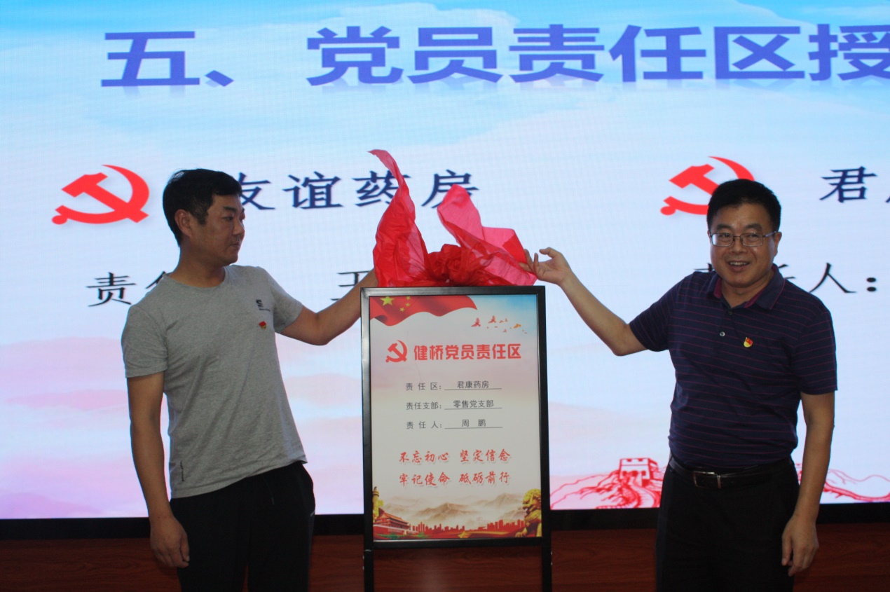 會議最后,公司黨委委員、零售連鎖公司總經(jīng)理徐偉為新設(shè)立的兩個黨員責任區(qū)友誼藥房和君康藥房授牌,責任區(qū)代表周鵬就如何立足本職崗位、發(fā)揮黨員先鋒模范作用作了發(fā)言。