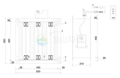 ![]() 遙控電動風閥 1:學習按鈕 2:電壓 3:電源 4:反轉 5:中心線 6:正轉 |